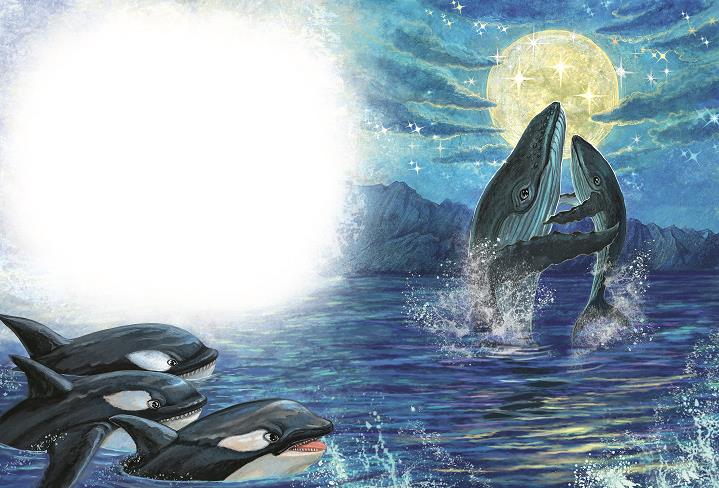 Он прижа́л сы́на к себе́ и и́зо всех сил уда́рил хвосто́м. Их бы́ло шесть и́ли семь. Их чёрно-бе́лые блестя́щие тела́ кружи́ли ря́дом, сло́вно водоворо́т над бе́здной впа́дин. Са́мая кру́пная схвати́ла малыша́ за хвост и потащи́ла на глубину́. Она́ зна́ла: его́ лёгкие пока́ сли́шком слабы́, что́бы удержа́ть не́бо да́же на не́сколько мину́т. Ги́ббо уда́рил хвосто́м. Коса́тки разлете́лись в сто́роны. Китёнок был спасён. Но че́рез секу́нду хи́щницы сно́ва повтори́ли а́таку.