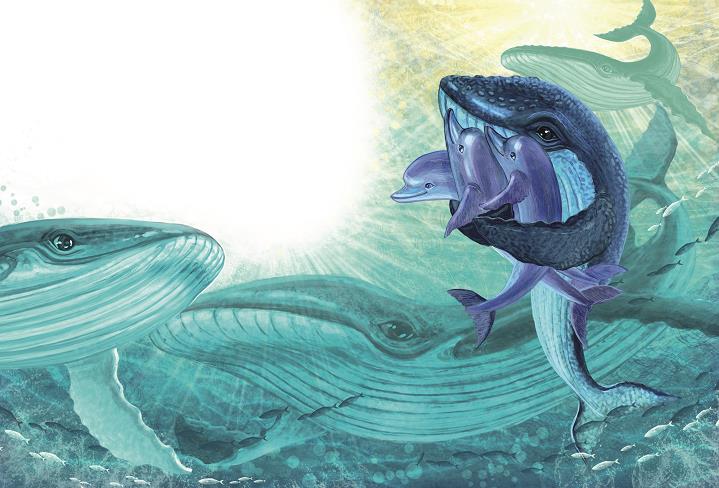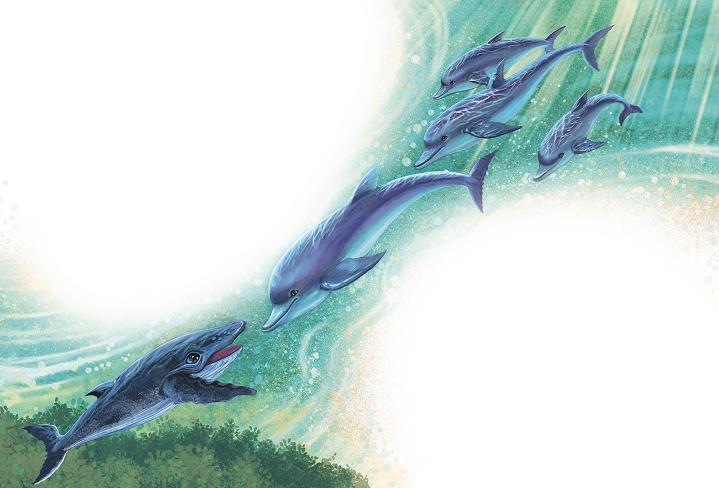 Так китёнок нашёл свою́ семью́ в дельфи́ньей ста́е. Они́ научи́ли его́ лови́ть ры́бу, пры́гать и ката́ться на волна́х. Обгоня́ть больши́е корабли́ и забо́титься друг о дру́ге…