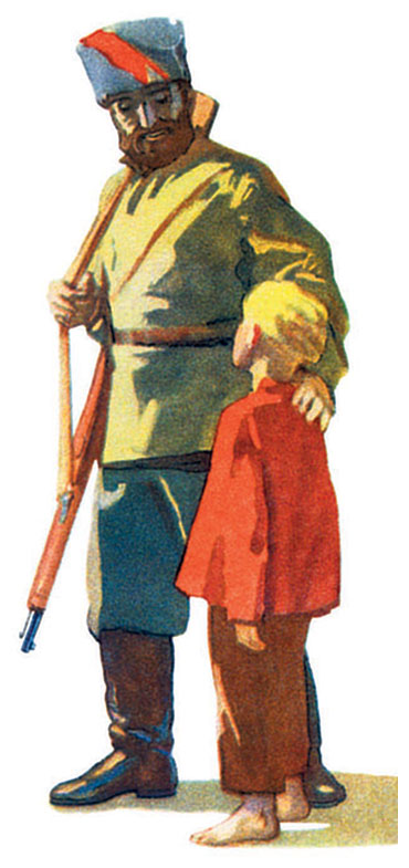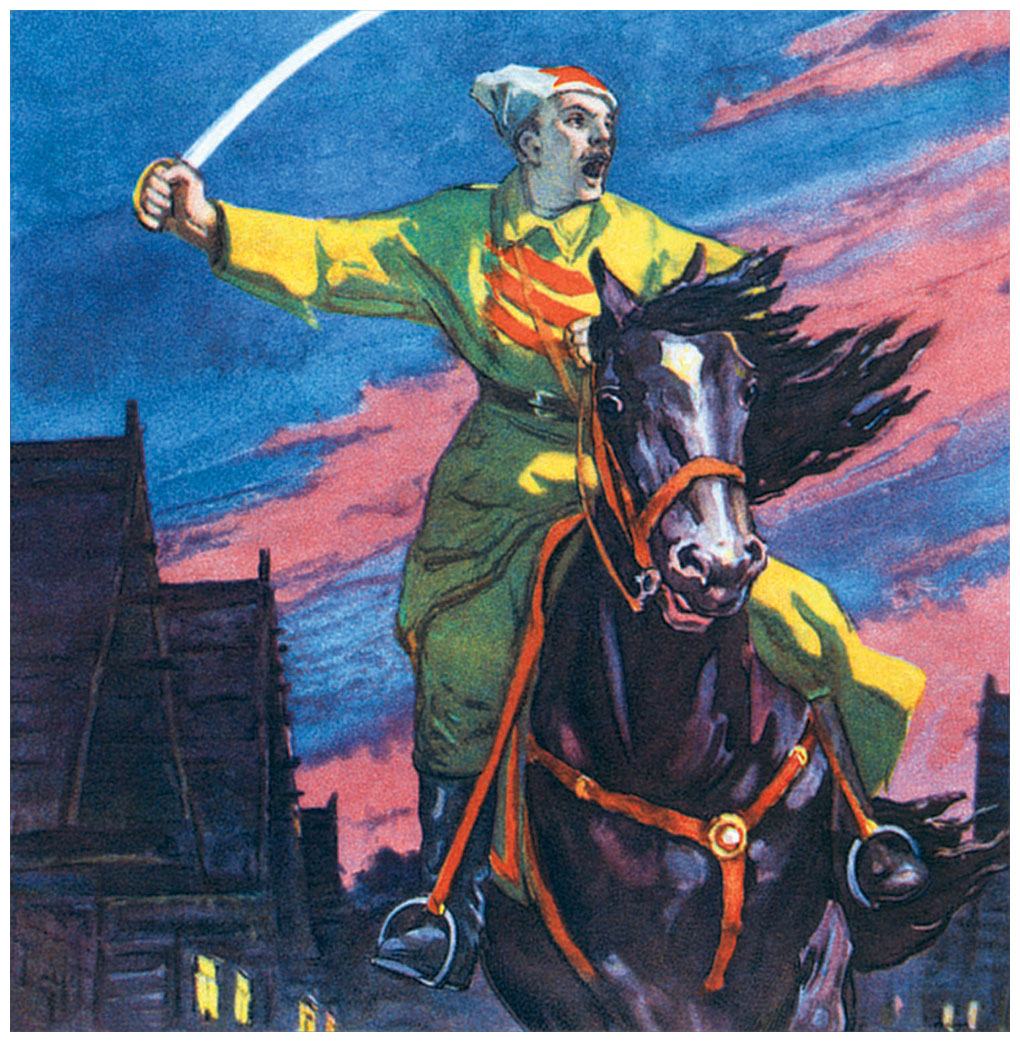 Вдруг слышит он на улице топот, у окон – стук. Глянул Мальчиш-Кибальчиш, и видит он: стоит у окна всадник. Конь – вороной, сабля – светлая, папаха – серая, а звезда – красная.