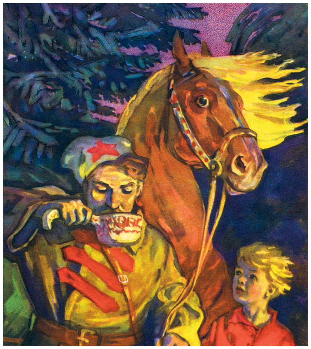 – Ну, вот… День проходит, два проходит. Выйдет Мальчиш на крыльцо: нет… не видать ещё Красной Армии. Залезет Мальчиш на крышу. Весь день с крыши не слезает. Нет, не видать. Лёг он к ночи спать. Вдруг слышит он на улице топот, у окошка – стук. Выглянул Мальчиш: стоит у окна тот же всадник. Только конь худой да усталый, только сабля погнутая, тёмная, только папаха простреленная, звезда разрубленная, а голова повязанная.