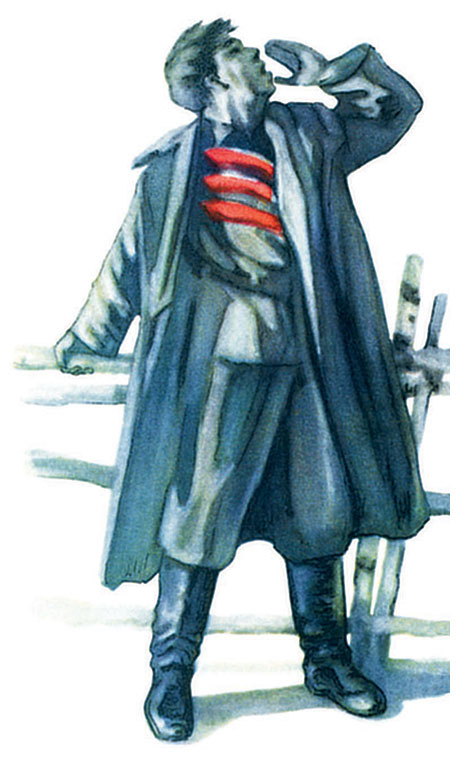 Вдруг он слышит на улице шаги, у окошка – шорох. Глянул Мальчиш и видит: стоит у окна всё тот же человек. Тот, да не тот: и коня нет – пропал конь, и сабли нет – сломалась сабля, и папахи нет – слетела папаха, да и сам-то стоит – шатается.