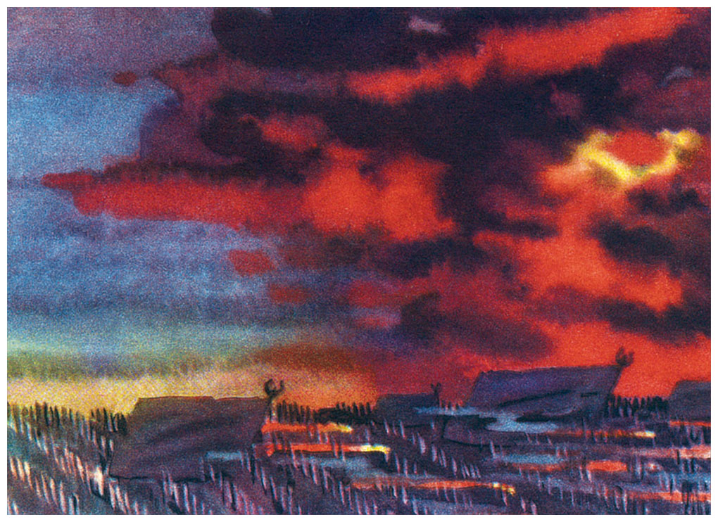 Вот однажды – дело к вечеру – вышел Мальчиш-Кибальчиш на крыльцо. Смотрит он – небо ясное, ветер тёплый, солнце к ночи за Чёрные горы садится. И всё бы хорошо, да что-то нехорошо. Слышится Мальчишу, будто то ли что-то гремит, то ли что-то стучит. Чудится Мальчишу, будто пахнет ветер не цветами с садов, не мёдом с лугов, а пахнет ветер то ли дымом с пожаров, то ли порохом с разрывов. Сказал он отцу, а отец усталый пришёл.