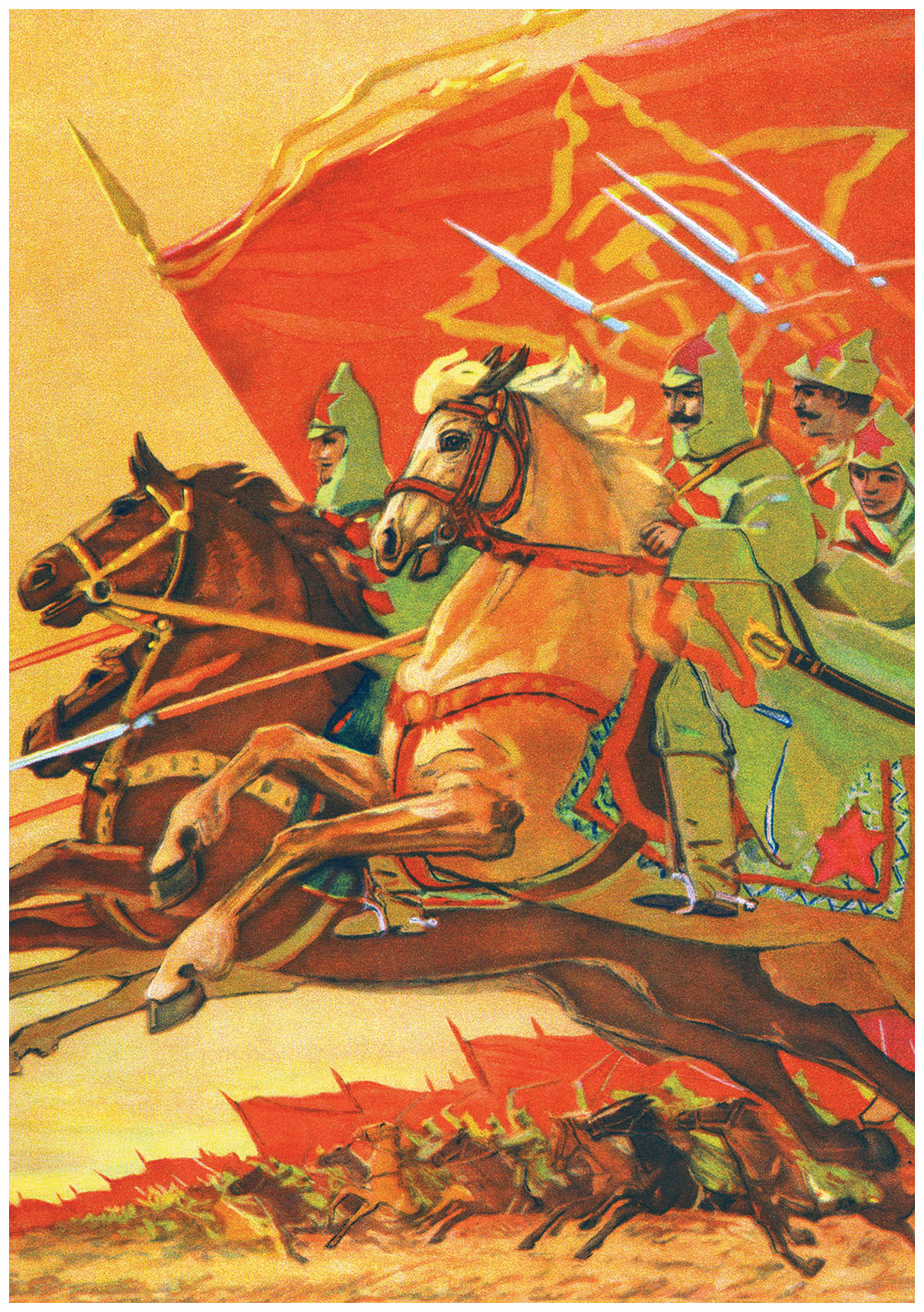 – Эй, вставайте! – крикнул всадник. – Пришла беда, откуда не ждали. Напал на нас из-за Чёрных гор проклятый буржуин. Опять уже свистят пули, опять уже рвутся снаряды. Бьются с буржуинами наши отряды, и мчатся гонцы звать на помощь далёкую Красную Армию.