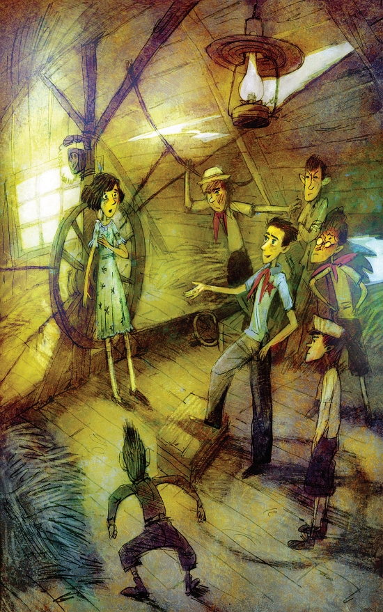 Прорвавшись через щели крыши, узкие прямые лучи солнца упали ей на лицо и платье. Но Женя поняла, что это неприятельские суда нащупывают ее своими прожекторами, и она решила дать им бой. С силой управляла она скрипучим колесом, маневрируя вправо и влево, и властно выкрикивала слова команды.