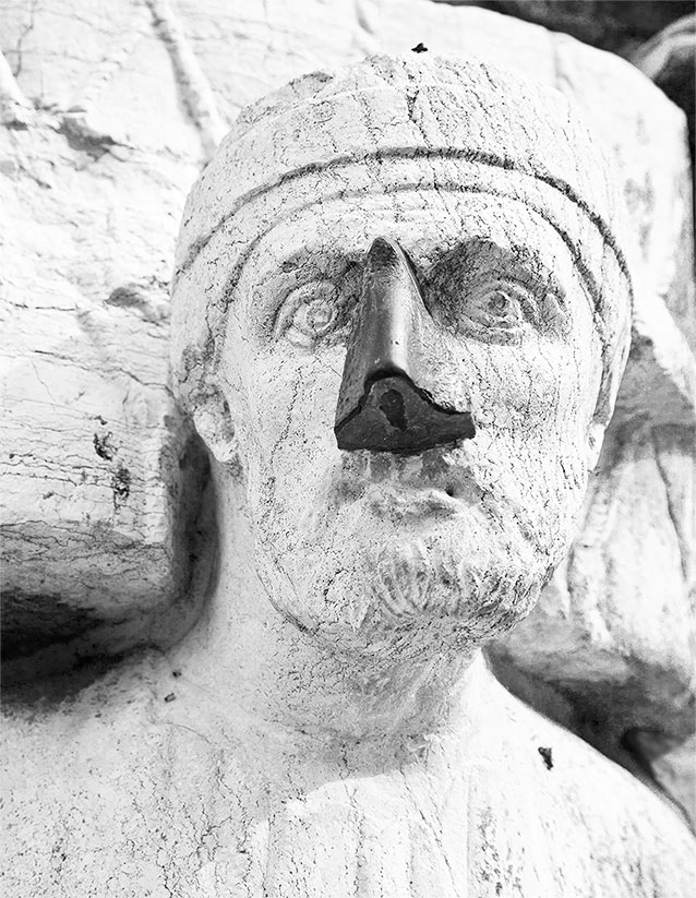Нос прыгнул в Рио делла Сенса, когда точно – неизвестно; некоторые считают, что в начале XIX века, но, может быть, и на несколько столетий раньше. Принадлежит же он Сеньору Риобе, Il Sior Rioba, Иль Сьор Риоба, – так прозвали венецианцы Антонио Риобу Мастелли, одного из членов очень богатого купеческого семейства, приехавшего в 1113 году в Венецию из Мореи, как именовался Пелопоннес в Венецианской республике. Мастелли в Венеции поселились и вскоре приобрели колоссальное влияние; им принадлежал целый квартал в Каннареджо, частью которого являлось Кампо деи Мори, в их честь и названное. Из всего семейства наиболее известны Антонио Риоба, так же как и его два брата, Санди и Альфани, благодаря следующей истории. Три этих брата были большими мастерами «обманов, слез, молений и проклятий», этакие три Скупых рыцаря. Когда они жили, опять же мне (да и никому, кажется, в мире) точно неизвестно, где-то в веке тринадцатом-четырнадцатом, но были большими душегубами. Однажды принесла одна вдова Риобе дублон старинный, но прежде с тремя детьми полдня перед окном она стояла на коленях воя. Шёл дождь, и перестал, и вновь пошёл, притворщица не трогалась; Риоба мог бы её прогнать, но что-то тут шептало, что мужнин долг она всё ж принесла и не захочет завтра быть в тюрьме, – Риоба дублон тот получил и был вдовою проклят. Вдова была очень богобоязненна, с колен поднялась и пошла к вечерней мессе в соседнюю церковь Мадонна делл’Орто, chiesa della Madonna dell’Orto, церковь Огородной Мадонны, снова на колени опустилась и вознесла молитву святой Марии Магдалине. Услышав рассказанную вдовой историю, Магдалина, вне себя от возмущения, побежала к Пречистой Деве, поделилась, и Дева тут же обо всём доложила Господу Нашему. Возмездие себя ждать не заставило, и вот вам результат: трое Мастелли обратились в каменные статуи и встали рядком в нишах дома, им же и принадлежавшего. Дом выходит фасадом на Кампо деи Мори и называется Ка’ Мастелли, Ca’ Mastelli, Домом Мастелли. Трёх наказанных Мастелли и сегодня можно видеть на прежних местах; позже к ним присоединился ещё один. Одни считают его четвёртым Мастелли, другие – слугой братьев. Бог Риобу продолжал наказывать, и, в довершение всех Риобиных несчастий, у него ещё и нос убежал. О том, как это случилось, я расскажу чуть позже, но все Риобу знают с налепленной ему на лицо очень грубой железякой, форма которой столетиями не меняется. Риоба походит на страдальца после пластической операции, а также напоминает несчастного майора Ковалёва, каким его обычно представляют режиссёры оперы «Нос» Дмитрия Шостаковича.