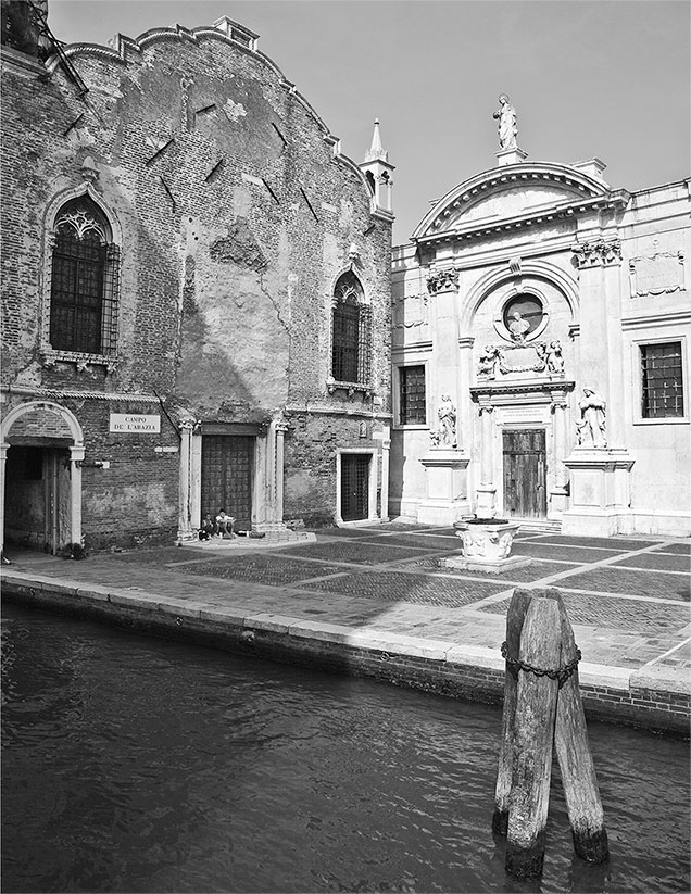 Нет более подходящего места на земле для чистки апельсинов, чем эта площадь. Сюда редкий турист залетает, а если и залетит, то по ошибке. Нечего туристу здесь делать, но что за чудо Кампо делл’Аббациа! Древний колодец с рельефом, прямо-таки позднероманским, готический фасад Скуола Веккиа делла Мизерикордиа, Scuola Vecchia della Misericordia, по-венециански готический, с двумя легкими башенками по сторонам фронтона, состоящего из череды округлостей, что придаёт архитектуре нечто мусульманское, и грубовато-барочный фасад церкви делл’Аббациа делла Мизерикордиа, chiesa dell’Abbazia della Misericordia, церкви Аббатства Милосердия, в середине XVII века украшенный премило неуклюжими скульптурами работы Клементе Моли, который не поскупился на младенцев – на фасаде их множество, – очень толстых и печальных, напоминающих о голицынском барокко. Чудный контраст средневековья и барокко, и площадь вымощена замечательными терракотовыми плитами, а в боковую стену церкви, чуть поодаль от барочного входа, вмонтирован отлично сохранившийся рельеф с Богородицей Орантой, прекрасный и византийский, как павлин на Доме Верблюда, и датируемый тем же, что и павлин, XIV веком: всё разноязыко, стройно и замечательно. Чудесней же всего полная запущенность Кампо делл’Аббациа, по сравнению с которым Кампо Сан Джоббе так просто Лас-Вегас.