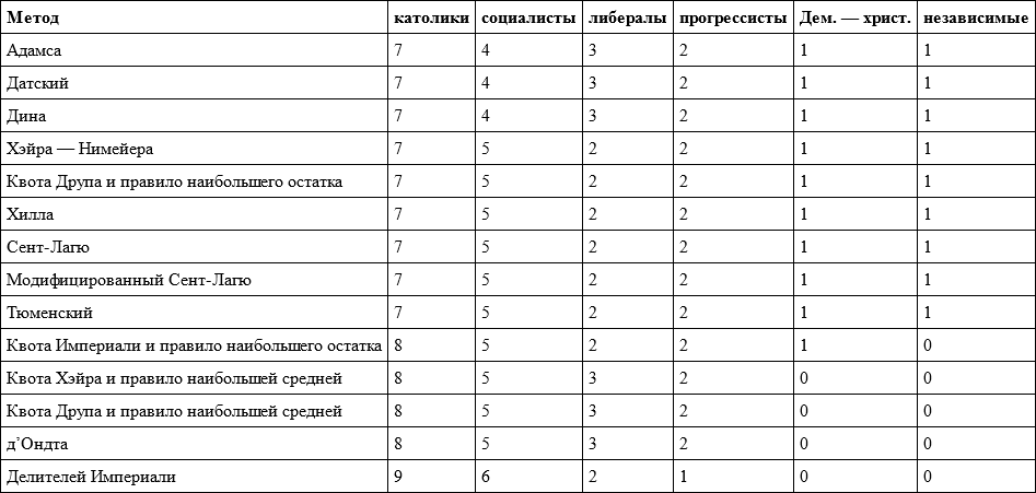 В предыдущих подразделах мы познакомились с большим числом методов распределения мандатов. В целом их получилось 30: шесть истинных методов делителей плюс три модификации методов делителей; для методов квот три различных квоты (квоты Гогенбах-Бишофа и Друпа можно считать за одну) и семь правил (правило наибольшего остатка, правило наибольшей средней и пять вариантов правила наибольшего частного) дают при умножении число 21.