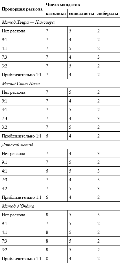 Таблица 4.13. Распределение мандатов по итогам голосования в брюссельском округе на выборах бельгийского парламента 1900 года с использованием различных методов