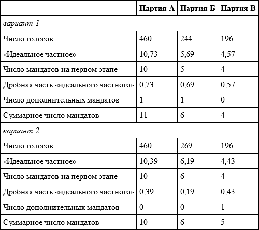 Так, уже отмечалось, что методы квот предусматривают распределение мандатов в два этапа. И эта их особенность часто подвергается критике, хотя само по себе деление на этапы довольно условное. Например, с критикой метода Хэйра – Нимейера неоднократно выступал профессор В. Е. Чиркин – один из наиболее авторитетных российских специалистов по конституционному праву, но, к сожалению, как и многие правоведы, далекий от математики. Вот что он написал в одной из последних публикаций: