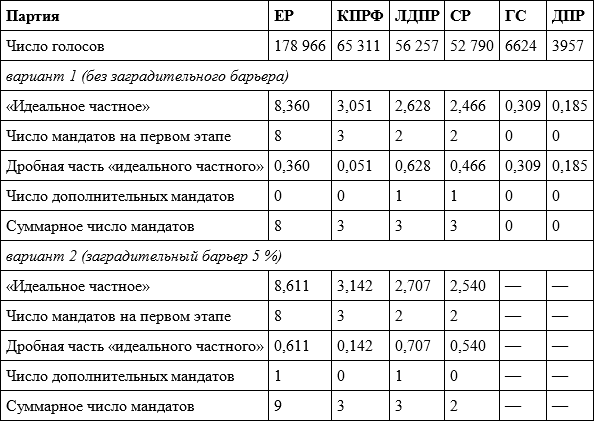 Если бы заградительного барьера не было и мандаты распределялись между шестью участвовавшими в выборах партиями (суммарное число голосов – 363 905, квота Хэйра – 21 406,176), «Гражданская сила» и ДПР все равно не получили бы ни одного мандата, но «Единой России» достались бы 8 мандатов, а «Справедливой России» – 3 мандата (см. верхнюю часть таблицы 4.16). Однако в соответствии с законом мандаты распределялись между четырьмя партиями, преодолевшими барьер (суммарное число голосов – 353 324, квота Хэйра – 20 783,765), и распределение оказалось другим: у «Единой России» дробная часть выросла с 0,360 до 0,611, и она получила дополнительный мандат за счет «Справедливой России», у которой дробная часть выросла меньше – с 0,466 до 0,540 (см. нижнюю часть таблицы 4.16).