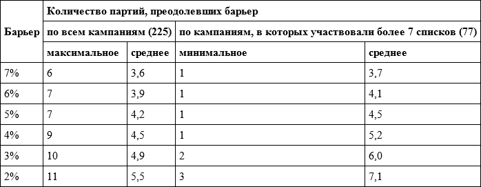 Каков же должен быть заградительный барьер, чтобы в парламент проходило не более 9 партий? Для ответа на этот вопрос ни к чему строить умозрительные конструкции, например предполагать крайне маловероятную ситуацию с равномерным распределением голосов. Разумнее обратиться к эмпирическим данным, тем более что одни только российские региональные выборы дают богатейшую статистику: за период с декабря 1993 года по сентябрь 2015 года по пропорциональной или смешанной избирательной системе прошли 225 избирательных кампаний по выборам законодательных органов субъектов РФ.