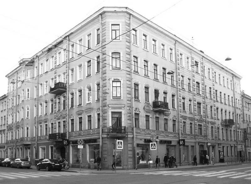 Дом № 24 / 8-я Советская ул., 15Угловой участок площадью в 200 кв. саженей с одноэтажным деревянным домом и обязательным для тех времен мезонином в 1854 г. принадлежал вдове чиновника 12-го класса Елене Петровне Соколовой. В 1868 г. документально засвидетельствован в собственниках купец Еким Федорович Федоров. В 1871 г. купчую совершила жена камердинера 9-го класса Дарья Семеновна Кадыкова. Это имение в 1881 г. она подарила почетному потомственному гражданину Семену Ивановичу Кадыкову. Шли годы, стареющие владельцы не могли управлять имуществом. Долги по взятым ссудам росли, и их дома были выставлены на городские публичные торги, где 10 мая 1891 г. петербургский мещанин Михаил Петрович Петров и купил все имущество. Только 26 ноября 1917 г. купец решился на продажу всего, чем еще владел. Владельцы менялись, но ни один из них не решался на кардинальную перестройку имения в духе времени. Производились внутренние переделки квартир, менялась система водоснабжения, но все это делалось в старых строениях[193]193