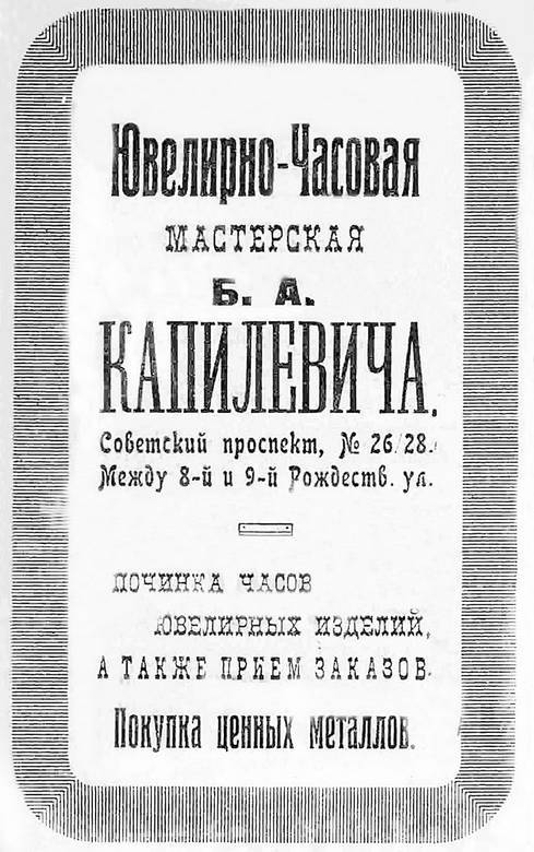 В 1920-х гг. в доме находилась ювелирно-часовая мастерская Б. И. Капилевича.