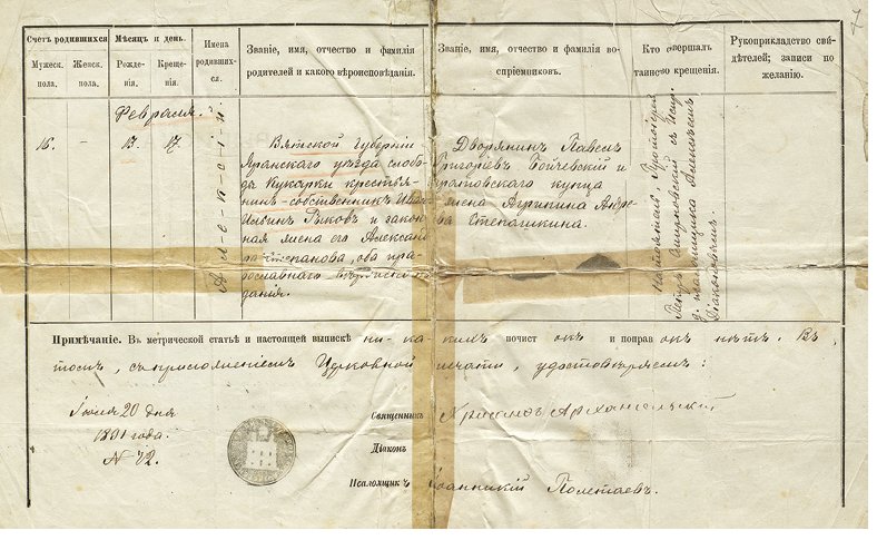 Выписка из метрической книги о рождении А.И. Рыкова 13 февраля 1881 года и крещении