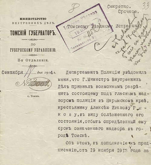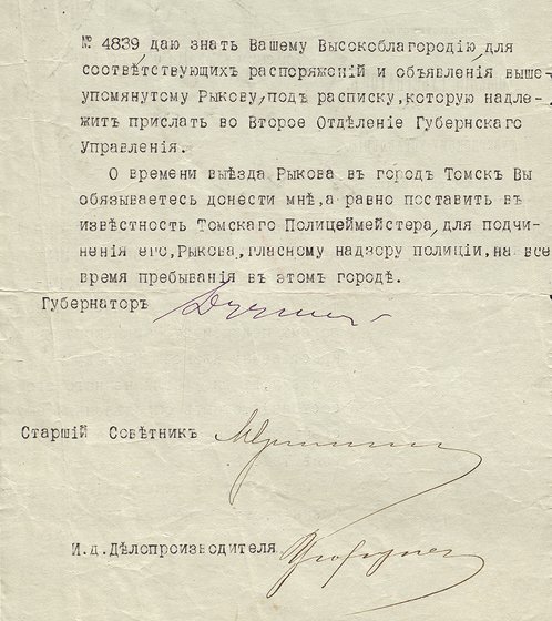 Предписание губернатора Томской губернии уездному исправнику о направлении Рыкова в Нарымский край под гласный надзор полиции.