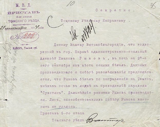 Донесение пристава 5-го стана Томского уезда уездному исправнику о побеге административно-ссыльного Рыкова из Нарыма.
