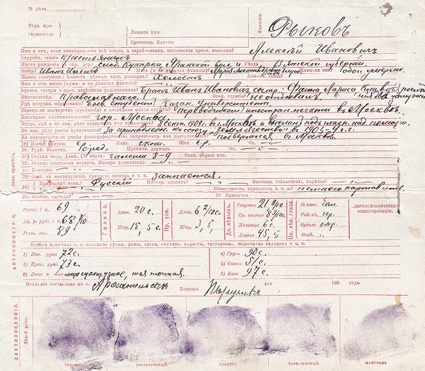 Карточка арестованного Рыкова. 1909 год. Дело было прекращено…