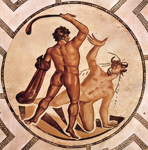 Римская мозаика, изображающая Тесея и Минотавра в центре лабиринта. III/II век до н. э.