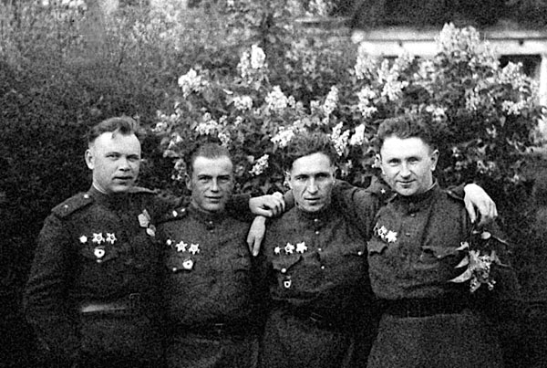 Встреча с «пуховцами» перед наступлением на Берлин. Слева направо: гв. м-р Соколов, гв. капитан Введенский С.М., гв. ст. л-т Шелемотов А.С., гв. м-р Сергеев П.И.