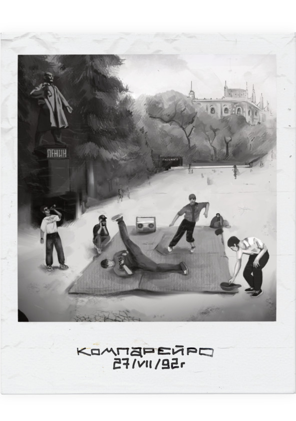 Помню, как мы начинали с Акимом, Витьком и Кольком танцевать во ВТУЗе на площади Энергетиков. Мы каждый раз, когда приходили, раздвигали парты, мыли полы, а стёкла-окна служили нам зеркалами, потому что это вечернее время было. Компания собралась разношёрстная: у Колька была классическая школа хореографии, он знал, как работает тело, что очень важно в брейке. Я знал физику тела. Витьку было достаточно крутить «гелик». А Аким… у Акима был подвешенный язык, и это часто выручало нас. Он танцевал поскольку-постольку, «кентуки» только более-менее нормально делал.
