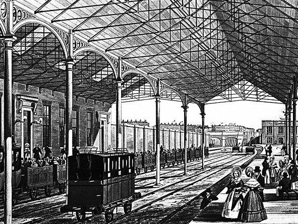 Железнодорожная станция Юстон (также Юстонский вокзал, Лондон-Юстон) – железнодорожный вокзал в центральной части Лондона, в районе Камден. Ранняя гравюра, изображающая Юстон с навесами из сварочного железа, возведёнными в 1837 году