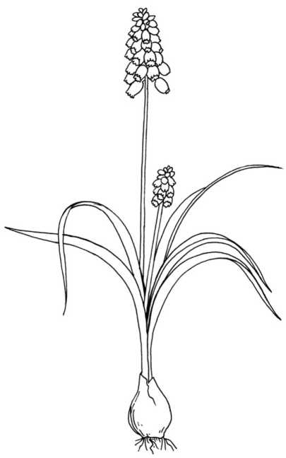 Мышиный гиацинт. Действительно, соцветие удивительно похоже на миниатюрное соцветие гиацинта. Невысокое (15–20 см) майское растение, цветущее голубыми, синими, сине-фиолетовыми, редко белыми цветками. Размножается очень быстро детками и семенами и начинает само себя вытеснять, если не рассаживать каждые 3 года. Одинаково хорошо растет на солнце, в полутени и даже в тени.