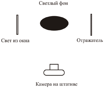 Чтобы форма предметов не «ушла» на темном заднем фоне, потребуется отражатель, для которого подойдет белая бумага, картон или пластик.