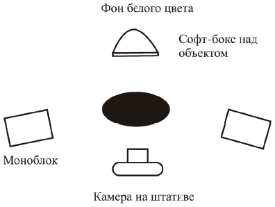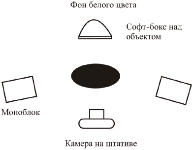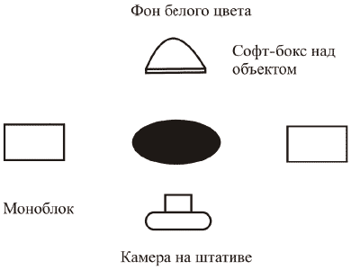 Вспышки (моноблоки) можно расположить слева и справа от объекта, направить на объект под небольшим углом. Желательно сделать источники света рассеянными, использовать софт-бокс или зонт. Расстояние от объекта до вспышек подбирайте экспериментальным путем (от 30 до 70 см). Для освещения небольших предметов лучше подбирать маленькие источники света. Третий источник расположите за предметом и выше, то есть над ним на расстоянии от 30 до 60 см. Сам объект должен быть удален от фона на расстояние 85–95 см.