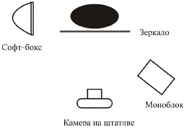 Вместо стеклянного стола можно использовать зеркало (рис. 8.30, 8.31). Свет может быть направлен фронтально и по бокам.