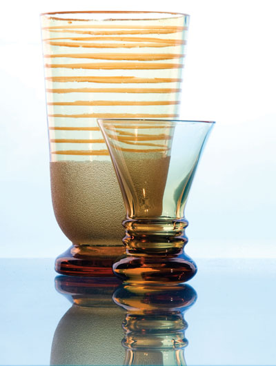 Чтобы получить блики на изделиях из стекла, вы можете воспользоваться отражателями, например куском золотистой фольги, зеркальцем. Используйте источники света небольшой мощности, чтобы избежать сильных бликов. Один источник света направьте на фон, а с помощью другого моделируйте объект. Рекомендуется установить источник моделирующего света над изделием под углом 45°. Боковое рассеянное освещение обычно создает на фотографии эффект прозрачности и объемности стеклянных изделий (рис. 8.32, 8.33). При съемке с одним источником света освещайте только фон. Располагая источник сверху, вы добьетесь передачи объема изделия. Источник, направленный прямо на изделие, должен играть второстепенную роль. Направив на стеклянный объект источник небольшой мощности, вы можете подчеркнуть контур предмета, но световых эффектов при этом не будет. Чем короче шкала тонов, тем более тонкими и хрупкими выглядят объекты на фотографии.
