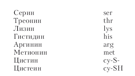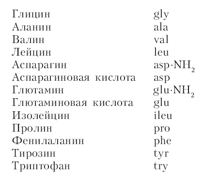 Я буду очень часто использовать эти названия в дальнейшем изложении. Для того чтобы сэкономить место, позвольте мне привести сокращенные наименования для каждой из аминокислот. Эти сокращения предложил в 30-х годах американский биохимик немецкого происхождения Эрвин Бранд. Сокращения эти легко запомнить, так как они состоят из первых трех букв названия каждой аминокислоты.