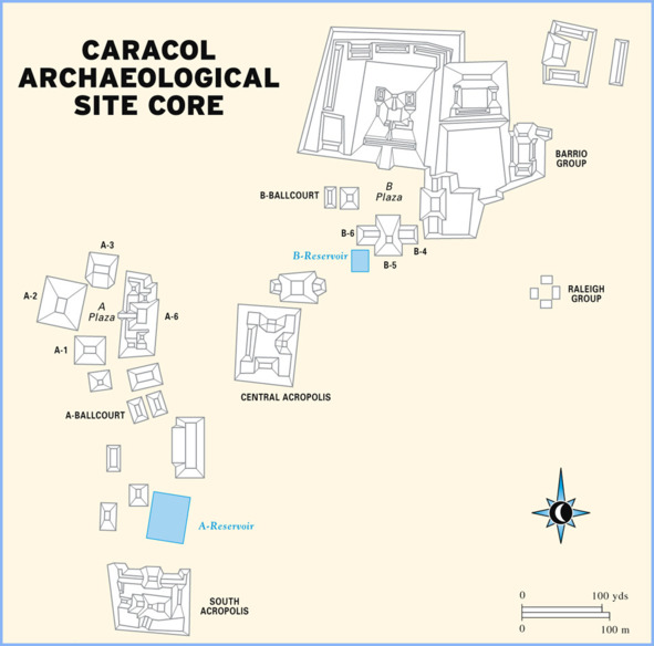 Википедия: Caracol is the name given to a large ancient Maya archaeological site, located in what is now the Cayo District of Belize. It is situated approximately 40 kilometres south of Xunantunich and the town of San Ignacio Cayo, and 15 kilometers away from the Macal River. It rests on the Vaca Plateau at an elevation of 500 meters above sea-level, in the foothills of the Maya Mountains. Long thought to be a tertiary center, it is now known that the site was one of the most important regional political centers of the Maya Lowlands during the Classic Period. Caracol covered approximately 200 square kilometers, [3] covering an area much larger than present-day Belize City (the largest metropolitan area in the country) and supported more than twice the modern city’s population. At Caracol, there are approximately 267 structures per square kilometer, 85% higher than Tikal. The site covers approximately 200 square kilometers, and within this area, structures are generally situated equidistantly and are integrated with the terrace system. The town grew into one of the largest ancient Maya cities, covering some 177 km² with an estimated population of over 100,000 with settlement focused along the many radiating causeways (potentially peaking between 120,000 and up to 180,000)