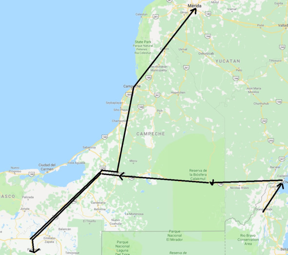 638 Карта основных передвижений в Мексике. Сначала от Оранж Волка в Четумаль, потом в Шпухиль (в центре), слева внизу – Паленке, в центре вверху – Мерида.