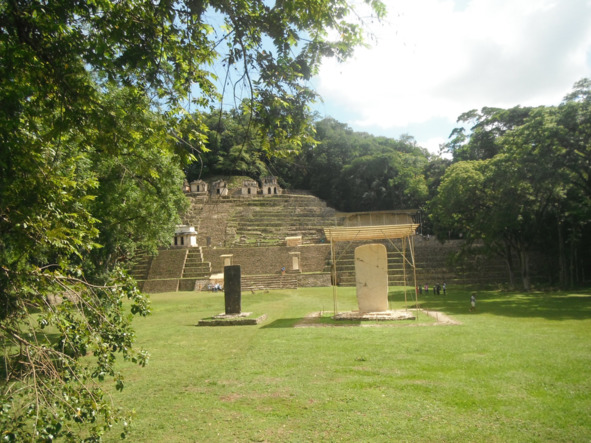 791 Стелы на платформе слева от входа на главную плазу Бонампака