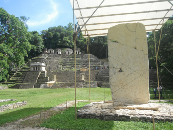 Бонампак, даже в эпоху расцвета – маленькое и незначительное поселение, отличается не только наличием фресок, сохранившихся благодаря тонкому слою натекшего силикона, но и тем, что на главной площади тут стояла одна из самых больших стел, виденных Кошем (сравнимо только с копанскими). Главная – высотой почти шесть метров, стелы изображали правителей города в моменты отправления ритуала 794—6.