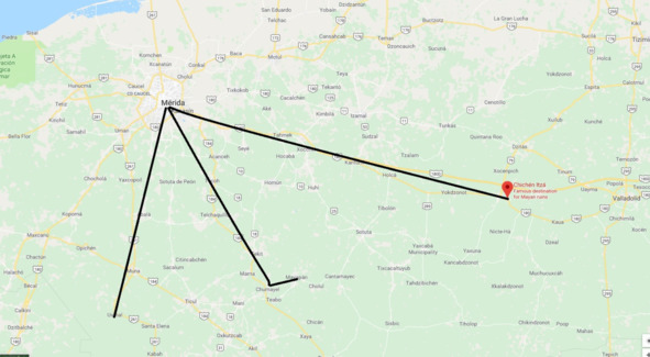 870 Карта путшествий из Мериды (слева направа): Ушмаль, Майяпан, Чичен-ица