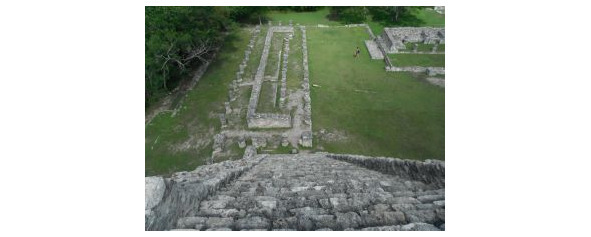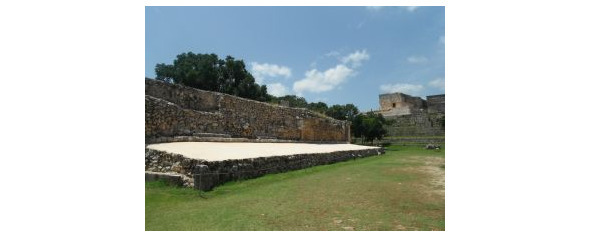 К югу от Женского монастыря находится опять-таки площадка для игры в мяч 883—4. Очень хорошая, качественная площадка. Хорошо реконструирована. И уж явно никак не похожа на то жалкое сооружение, что мы копали на раскопе номер 3 в Цунуне. Ну, разве что, тем, что два параллельных здания.