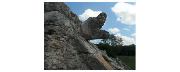 Форма последнего слоя пирамиды отражает дух времени и места – она овальная, а не четырехугольная. Почему-то стало модно закруглять пирамиды. Сзади, с запада, пирамида Волшебника примыкает к зданиям, окружающим двор Монастыря.