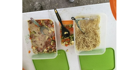 На обед мы стекались к главному сборному пункту – двум большим столам рядом с «нулевым километром» 1153. Еду готовили с утра, и привозили в пластиковых ящиках. Ее выставляли на столы, (первые кто добирался до столов) раскладывали пластиковые ложки-вилки 1154. Народ мыл руки, набирал еды и устраивался неподалеку. Кому-то удавалось сесть на пеньки, а кто-то садился прямо на землю. Кош прислонялся к какому-нибудь дереву (тоже небезопасно, но лучше, чем сидеть на земле).