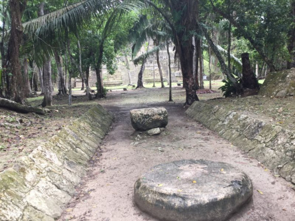 От храма Ягуара можно пойти осмотреть жилые кварталы, а можно просто пройти по аллее. Так и сделани (кварталы мы осмотрели в прошлый раз, от них остались почти одни фундаменты). Выход с главной аллеи открывается на большую плазу, где располагается теннисный корт площадка для игры в мяч. Площадка была хорошо, но в меру, реставрирована. Посредине лежали те самые камни-маркеры, под которыми в свое время обнаружили потрясающие схроны артефактов, в том числе сосуд с пятнадцатью граммами жидкой ртути – самое большое количество майянской ртути, когда либо найденное 1171. Майя собирали ртуть, где только могли.