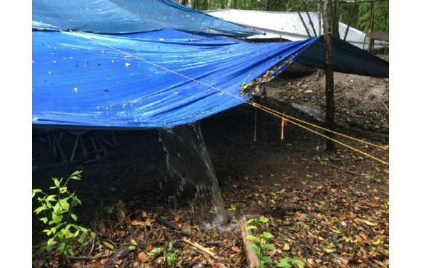 В случае нашей пирамиды это выглядело следующим образом. Тарполин, которым прикрывали раскоп от дождя и листьев, был постлан на выметенный, отпрофилированный и трехмерно-сфотографированный раскоп 1205. На него мы, по цепочке, стали кидать камни, ранее вынутые из раскопа и сложенные отдельной кучкой (камни всегда складываются отдельно от почвы из ведер) 1206. После камней, раскоп принялись закидывать почвой. Для этого два-три человека с лопатами наполняли ведра почвой, а остальные таскали их и выбрасывали ровным слоем на тарполин. В итоге, образовался тонкий слой почвы.