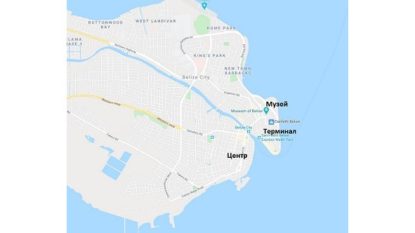 1216 Карта расположения терминала автобусов и водных такси в центре Белиз-сити (гугломап)