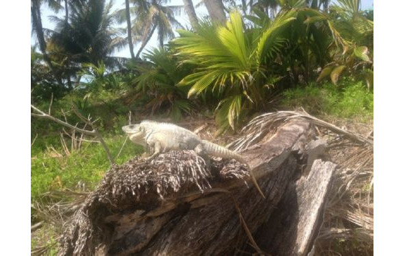 Дальше тропинка шла вдоль северного (вероятно) берега атолла, через джунгли. Тут и там были поставлены большие щиты с описанием эндемической фауны и флоры острова. Особенно он славился каким-то видом красноногой олуши, обитающей на западных Карибах только тут, а также какой-то белизский листопалый геккон, вообще совсем эндемический, только на атолле. И куча прочих животных, из которых на виду были только крабы, игуаны, а также птицы-фрегаты.