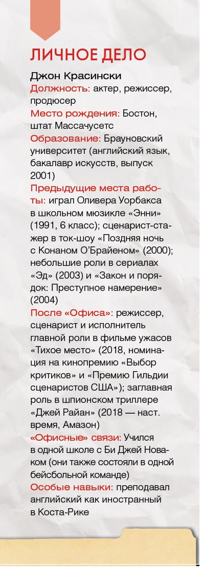 ДЖОН КРАСИНСКИ: Мы все сидели в одной комнате, и я не на шутку разволновался. Слушай, у меня сейчас тако-о-о-ой мощный флэшбек! Помню, заходит Би Джей Новак, а я его со школьных времен не видел. Мы учились в одной школе [речь о Южной школе Ньютона в Массачусетсе]. Мне это просто крышу снесло. Представьте: вы встречаете своего однокашника в обстановке, которая и так весьма необычна сама по себе. Я жутко нервничал, а тут распереживался еще больше. Ведь в школе Би Джей участвовал во всех постановках – играл, режиссировал. А я с трудом мог назвать себя актером. Да не был я никаким актером, я работал официантом. Ну и я спрашиваю: «На какую роль будешь прослушиваться?». А он такой: «Хочу сыграть Райана». Я: «А, не Джима? Круто, чувак. Просто класс!».