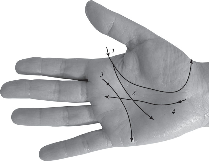Фото 66. Направления датирования основных линий: 1 – линия Жизни, 2 – линия Головы, 3 – линия Сердца, 4 – линия Сатурна