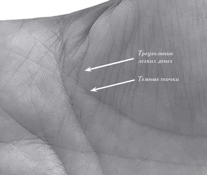 На линии Жизни есть треугольник легких денег в сочетании с линией удачи – знак внезапного улучшения материального благополучия. Этот знак хронологически соответствует 27 годам. После этого знака линия Жизни ослабевает и темнеет (через 1–1,5 года), что говорит о неблагоприятном периоде, который, как правило, наступает после периода удачи. Чуть позже линию Жизни пересекают две кометы (через 2–3 года), которые могут говорить о переменах в семейной жизни и рождении ребенка. Хронологический анализ возможных событий следующий: через 1–1,5 года возможен спад в бизнесе, поэтому в этот период необходимо ограничить все риски и сосредоточиться на личной жизни – благоприятный период для брака и рождения ребенка через 2–3 года.
