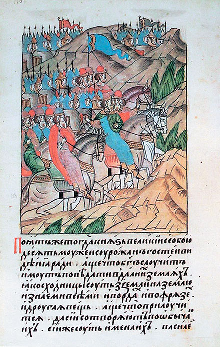 Сыновья же русские вступили в обширные поля коломенские, но и тут не вместиться огромному войску, и невозможно было никому взором окинуть рати великого князя. Князь же великий, въехав на возвышенное место с братом своим, с князем Владимиром Андреевичем, видя великое множество людей снаряженных, возрадовался и назначил каждому полку воеводу. Себе же князь великий взял под командование белозерских князей и в полк правой руки назначил брата своего князя Владимира и дал ему под командование ярославских князей, а в полк левой руки назначил князя Глеба Брянского. Передовой же полк – Дмитрий Всеволодович да брат его Владимир Всеволодович, с коломенцами – воевода Микула Васильевич, владимирский же воевода и юрьевский – Тимофей Волуевич, а костромской воевода – Иван Родионович Квашня, переяславский же воевода – Андрей Серкизович. А у князя Владимира Андреевича воеводы: Данило Белеут, Константин Кононов, князь Федор Елецкий, князь Юрий Мещерский, князь Андрей Муромский.