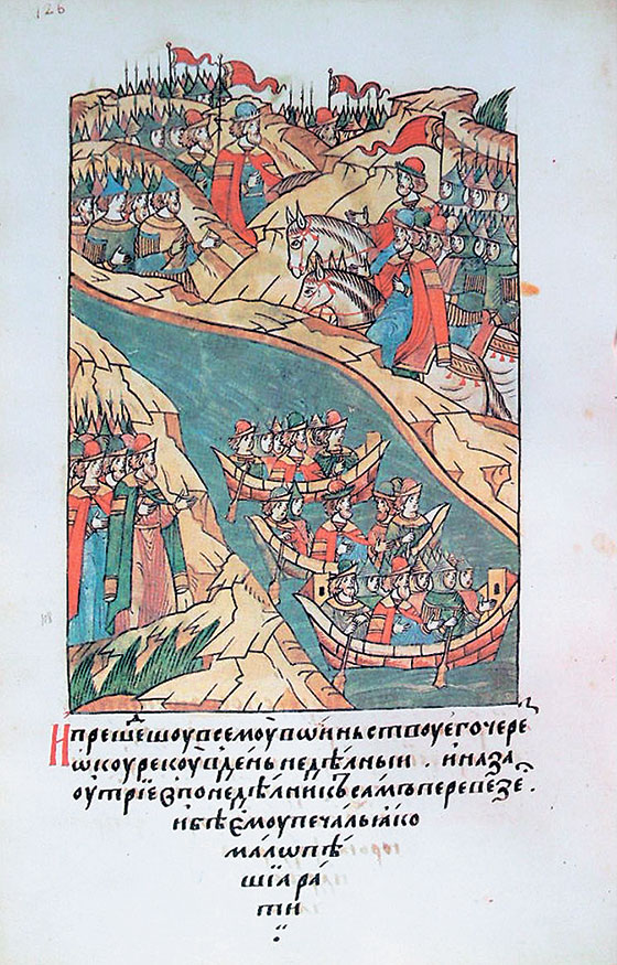 Великий князь Дмитрий Иванович переправляется со своим войском через Оку. Миниатюра из «Повести о Куликовской битве». XVI в.