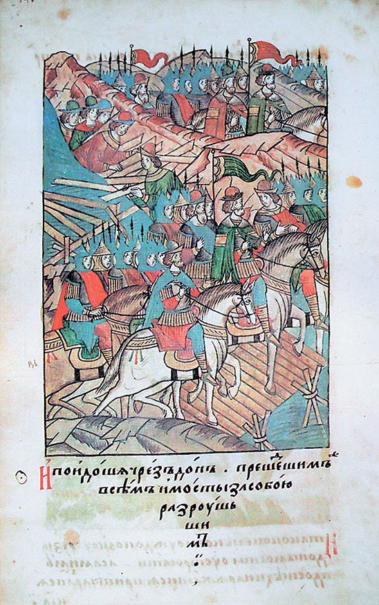 И двигался князь великий Дмитрий Иванович по большой широкой дороге, а за ним русские сыны идут скоро, будто медвяные чаши пить и гроздья виноградные есть, желая себе чести добыть и славного имени: уже ведь, братья, стук стучит и гром гремит на ранней заре, князь Владимир Андреевич через Москву-реку переправляется на добром перевозе на Боровском.