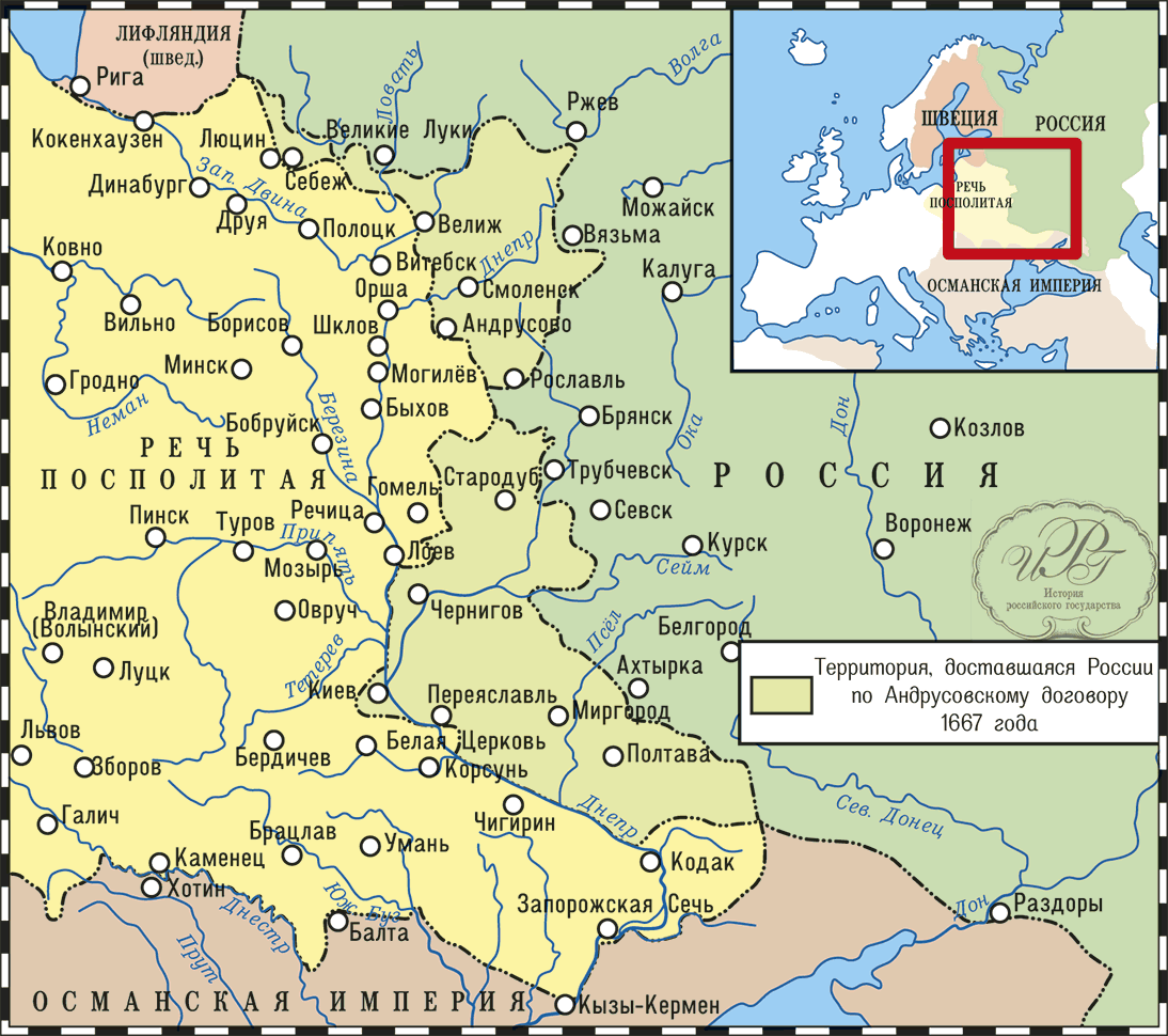 Россия получила Смоленск и западнорусские области, а также Левобережную Украину. Кроме того, ей оставался Киев – на два года.